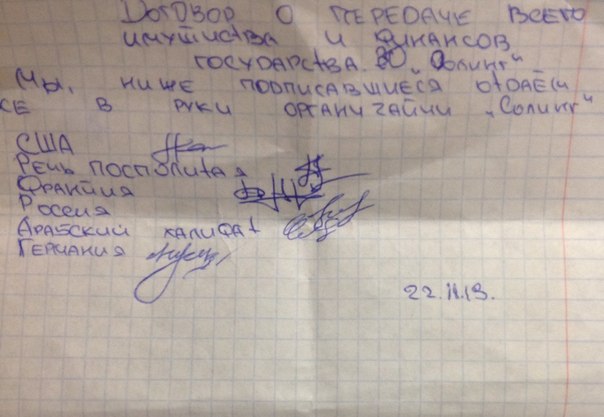 Что же творится в США?  США не может выплатить свои долги. Она по крупицам пытается собрать средства для погашения долгов. Правительство не может справиться со сложившейся ситуацией и обращается к крупному бизнесу. А с Германией вообще расплачиваются топливом. В настоящий момент долги выплачены только Франции, Катаре и Германии частично топливом. Что будет делать Америка?! На что она будет существовать?!